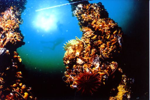 Batık alman torpidobotu üzerinde midye, deniz kestanesi, iskorpit ve dalıcılar Yer: Çanakkale Boğazı (Liman önü) Derinlik: 12 m